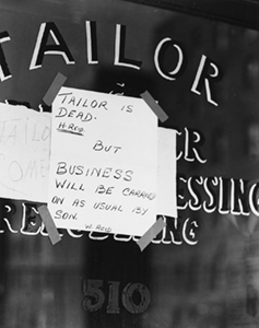 To that point, early on, a double-page spread presents a sequence of eight photos, reproduced at equal size, showcasing signs hung in doorways welcoming home returning American GI’s at the end of World War II. Later, towards the middle of the book, a photo of a handwritten note taped to a store window perfectly captures the impersonal, terse, and businesslike side of the city while giving Hemingway’s shortest story a run for its money: “TAILOR IS DEAD. BUT BUSINESS WILL BE CARRIED ON AS USUAL BY SON.” Putting space between these images enables them to be appreciated separately; had she placed them together, it would have dulled their impact and felt too repetitive.