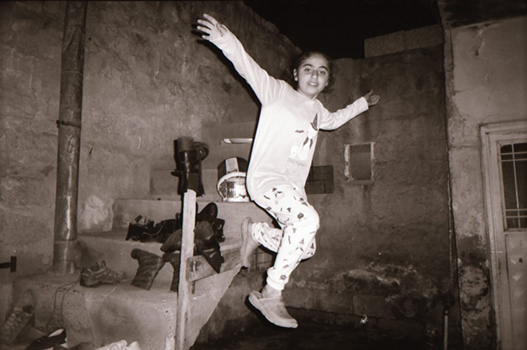 The photos are either printed one per page or laid out across two pages, and most come at you in short, staccato bursts. In one spread, the photo on the left-hand page shows a young girl at prayer in an empty rug-covered room next to a generic plastic chair that is slightly taller than she is. The photo on the right shows a young boy practicing with a hula hoop indoors. It appears to have been taken in the same room—or perhaps a similar room. (The living spaces have a cramped uniformity.) In a few instances, grown-ups (parents and relatives) are pictured, but mostly it’s just kids, in their own worlds.