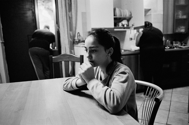 Photographing in his native Italy (mainly in Napoli and Cosenza), Battiloro documents intimate domestic moments. The people in these photos make their homes in disadvantaged, overcrowded urban neighborhoods, yet this is not intended as a socially concerned documentary work in the traditional sense. Battiloro has assembled a set of photographs that illustrate more abstract concepts – foremost among them, the need for human connection. One might think of this as a collection of short poems that complement, reflect, and build on each other – variations on a theme, on what it means to “only connect,” as E.M. Forster phrased it.